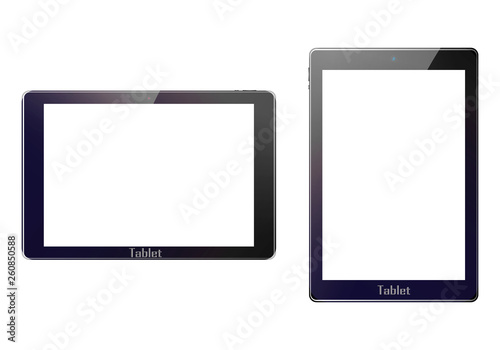 Realistic black tablet with flare and camera, and an empty space on the screen, isolated background