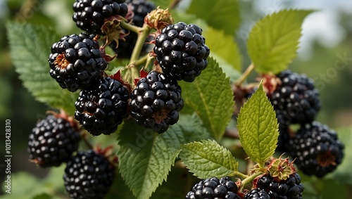 Realistic blackberry bush branch laden with ripe blackberries against a plain backdrop.