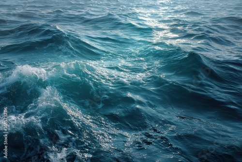 Realistic blue sea water texture showcases gentle waves and shimmering surface under daylight, creating a tranquil aquatic atmosphere