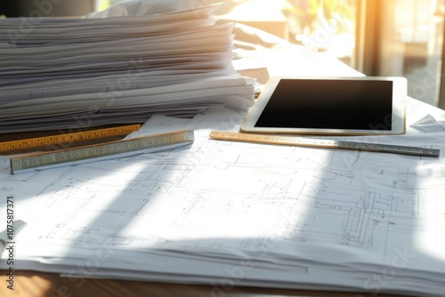 Realistic candid photo of construction blueprints, a digital tablet, and a ruler on a civil engineer’s desk, symbolizing the careful organization required for project management. The bright, happy