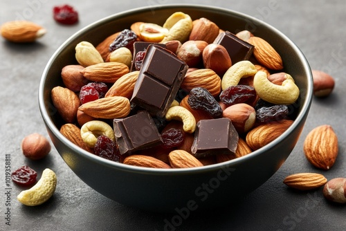 Realistic depiction of a variety of nuts, dried fruits, and dark chocolate chunks in a bowl, representing a sweet and healthy vegan snack
