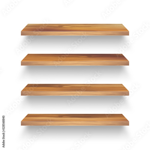 Realistic empty wooden store shelves set. Product shelf with wood texture. Grocery wall rack. Vector illustration.