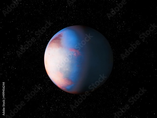 Realistic exoplanet in space with stars, distant planet with atmosphere, cosmic background.
