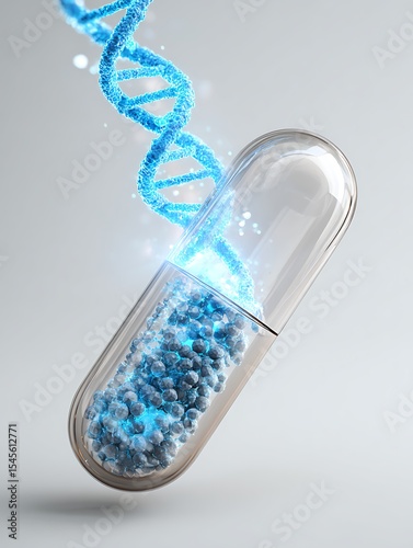 realistic glowing blue DNA strand emerging from an open medical capsule, suspended in air, clean white background,