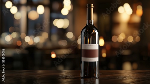Realistic mockup of a wine bottle with custom label, placed on a wooden table with dim lighting