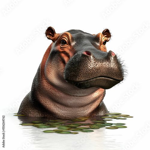 Realistic Portrait of a Hippopotamus Emerging from Water Surrounded by Lily Pads in a Peaceful Natural Setting
