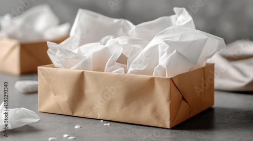 Realistic texture and daily use vibe. Kraft paper tissue box with crumpled white tissues on grey surface. Ideal for hygiene, packaging mockups, and lifestyle visuals.
