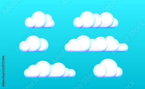 Realistic three-dimensional plastic set light Clouds Icon, White toy. Cloud symbol web. Modern glossy colorful design on blue. Beautiful decorative luxury vector illustration isolated. App, UI, EPS10