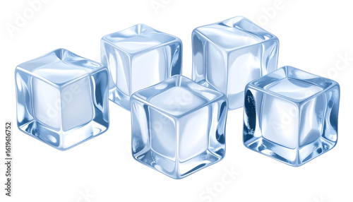Realistic transparent ice cubes, isolated on a transparent background, PNG format.