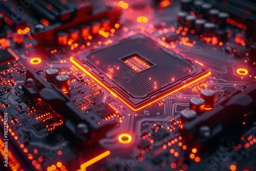 Realistic visualization of a cryptocurrency mining motherboard and cyber armor robot model