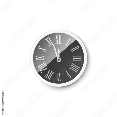 Realistic wall clock with black dial and roman numerals, 3d vector illustration isolated on white background.
