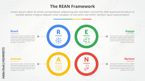 REAN framework infographic concept for slide presentation with big circle outline square structure with 4 point list with flat style