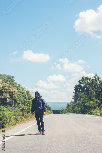 Rear of hiker man walking on the rural road on vacation. Holiday tourism concept.