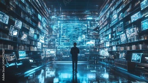 Rear shot of a student surrounded by educational graphics and digital holograms in a futuristic library
