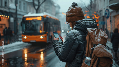 Rear view. A passenger on the street checking his phone in front of an electric minibus. Generative AI.