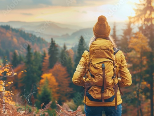 Rear view of a female hiker with a backpack admiring a scenic autumn landscape