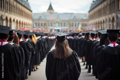 Rear view of a group of students in gowns and mortarboards, Rear view of university graduates wearing graduation gown and cap in convocation day, education concept