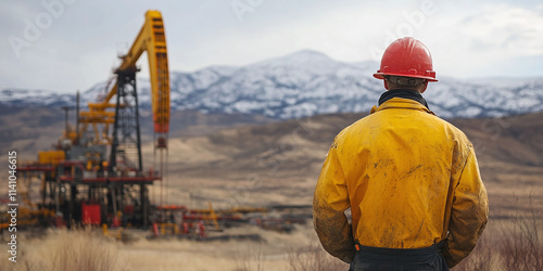Rear view of an oil rig worker wearing a yellow jacket and red helmet, standing on a site with a mountainous landscape in the background.