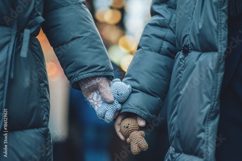 Rear view of couple on christmas market looking at decorative toys and souvenirs