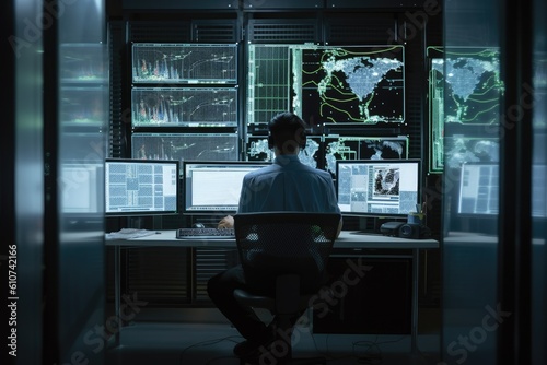 Rear view of man sitting in front of computer monitors in dark room, An IT specialist rear view working on a personal data security, AI Generated