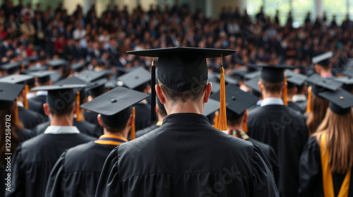 Rear view of university graduates wearing graduation gown and cap in the commencement day