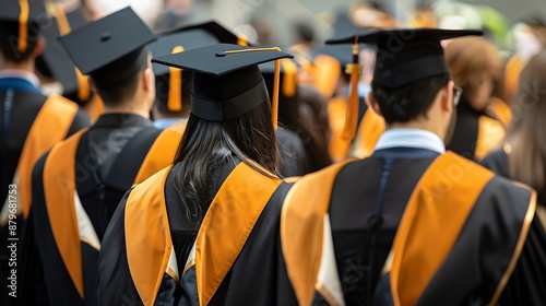 Rearview of university graduates wearing an academic gown on commencement day Education stock photo : Generative AI