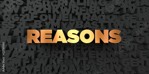 Reasons - Gold text on black background - 3D rendered royalty free stock picture. This image can be used for an online website banner ad or a print postcard.
