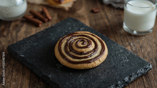 Recently prepared chocolate-covered rolled bun placed on a black stone chopping board. Minimal depth of field.