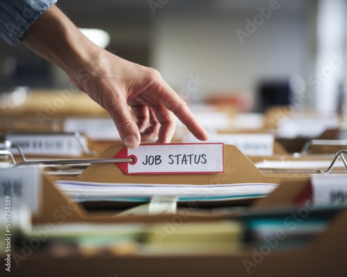 Recession job loss statistics concept. A hand reaching for a file labeled 'JOB STATUS' among organized folders.