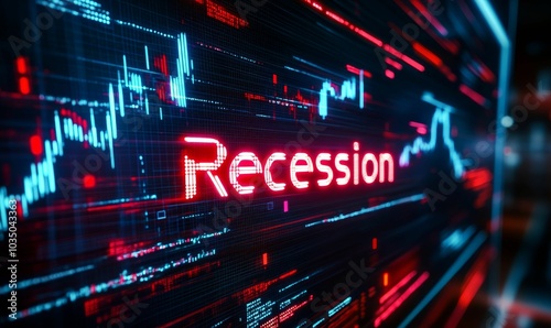 Recession text on a digital stock market chart.