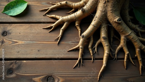 Reclaimed wooden boards with tree roots as background, forest environment, rustic decor
