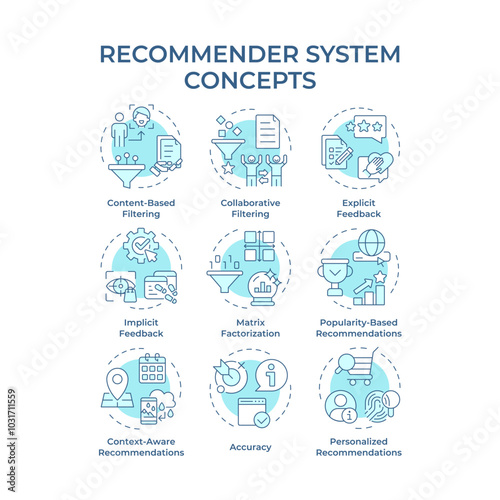 Recommender system soft blue concept icons. Artificial intelligence, deep learning. Personalized content. Icon pack. Vector images. Round shape illustrations for article, blog post. Abstract idea