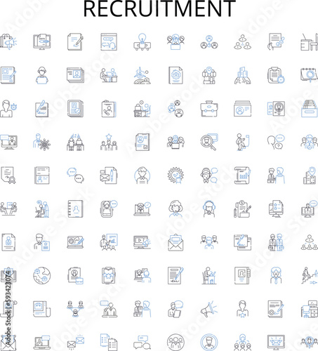 Recruitment outline icons collection. Hiring, Interviews, Staffing, Job-seeking, CVs, Candidates, Skills vector illustration set. Resumes, Networking, Outreach linear signs
