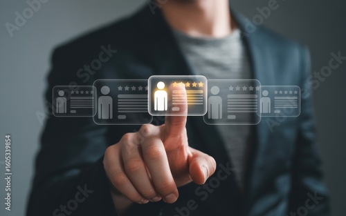 Recruitment process concept - selecting the best candidate from a list of profiles with a user's finger touching the screen
