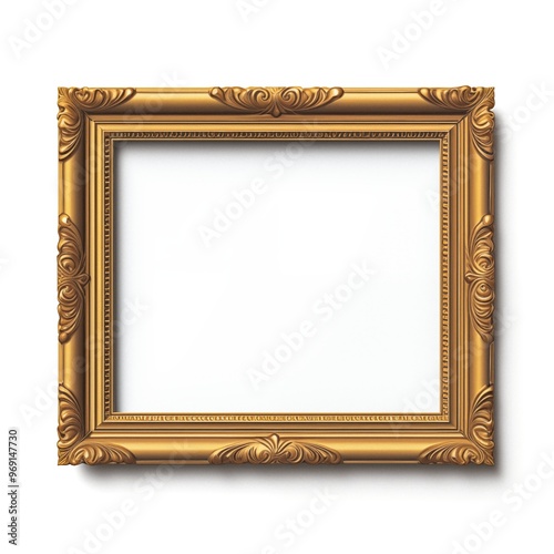 Rectangular golden picture frame with decorative ornaments, empty background, classic elegance