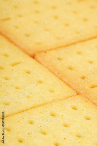 Rectangular, savory salty cheese-flavored biscuits with a golden-yellow color, neatly stacked. Perfect as a snack. Photographed on a white background.