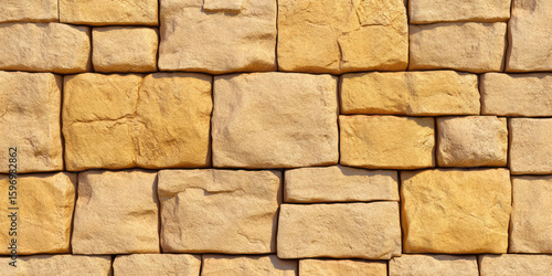 Rectangular yellow and beige stones are neatly stacked to form a textured wall. Rustic and architectural design
