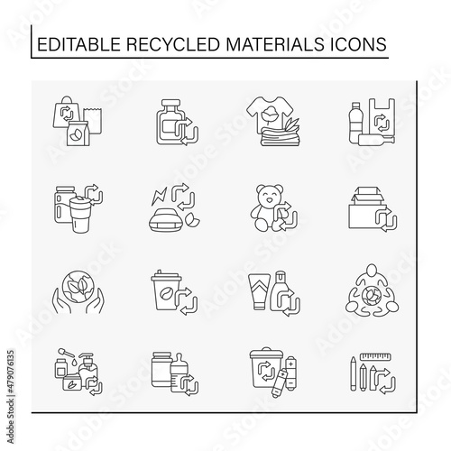 Recycled materials line icons set. Reusable products. Waste of glass, plastic and paper. Ecology concept. Isolated vector illustrations. Editable stroke