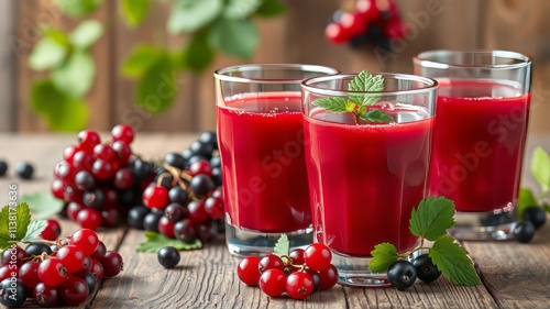Red & Black Currant Juice on Wooden Table - Fresh Fruit Drink Photography