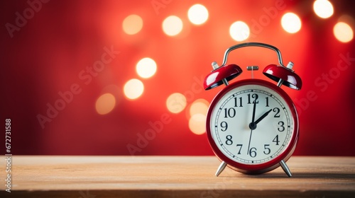 red alarm clock on wooden table with copy space and bokeh, copy space, 16:9