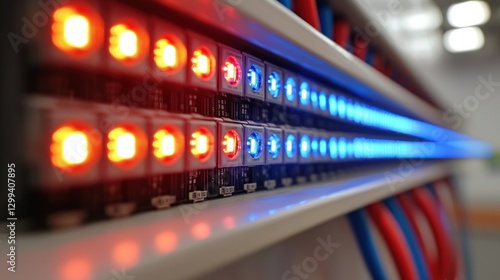 Red and blue LED lights in a panel, showing technology and electronics solutions