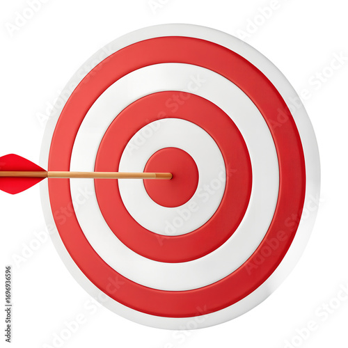 Red and white circular dartboard with an arrow hitting the bullseye isolated on transparent background