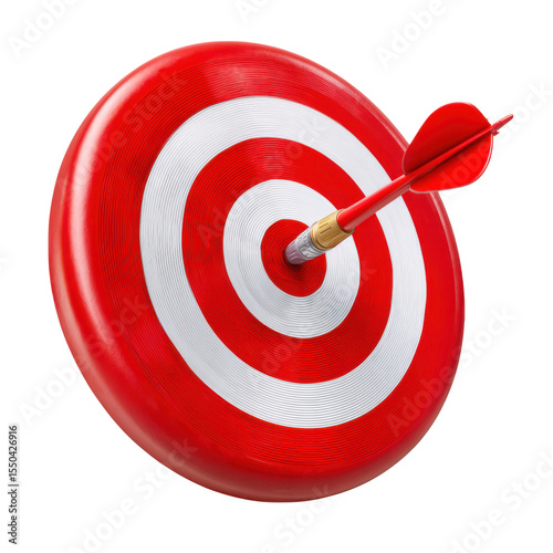 Red and white dartboard with dart in center isolated on transparent background