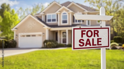 Red and white for sale sign in front of a well-lit suburban home with wide driveway and manicured lawn..