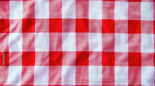 Red and white gingham tablecloth background. Flat lay, top-down close-up photo.