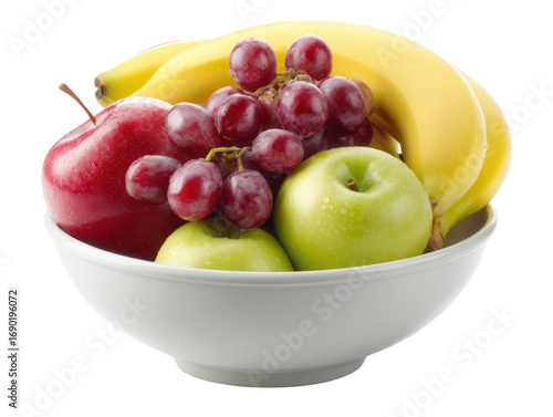 Red apples green apples red grapes and bananas in a white bowl Isolate