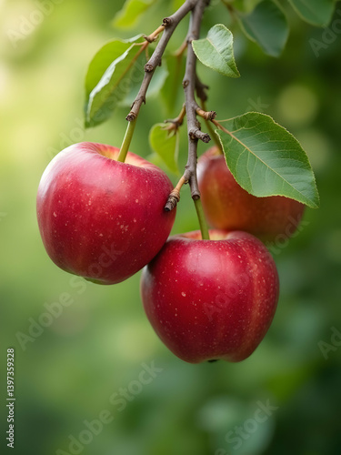 Red apples hanging on a tree branch with green leaves, vibrant fruit in natural orchard setting, fresh organic produce, healthy food background, high-quality stock photo, close-up