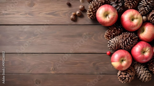 Red apples, pine cones, acorns, Top view of autumn themed still life on wooden background with space for text.