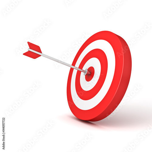 Red arrow hit to the center of goal target dartboard isolated on white background with shadow the business creative idea concepts 3D rendering