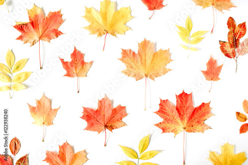 red autumn maple leaf pattern on white background. flat lay, top view. autumn wallpaper